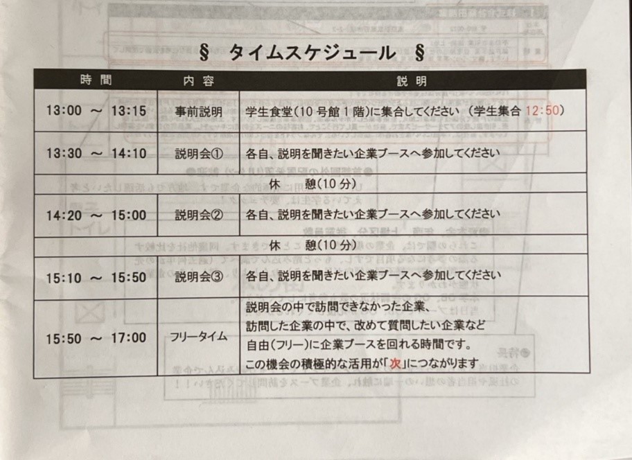 OB・OG(大正の卒業生)がいない企業も来ますし、官公庁(市役所や国の機関のこと)も来ていました。民間企業以外の就職を考えている学生も必見です。